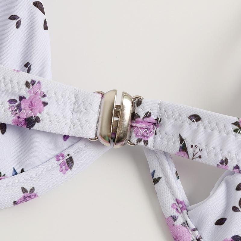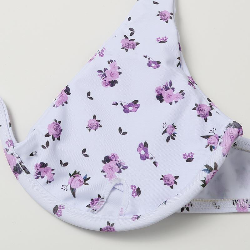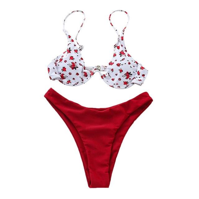 Bikini con estampado floral en color rojo o lila. Tiene aros, almohadillas extraíbles y tirantes ajustables.